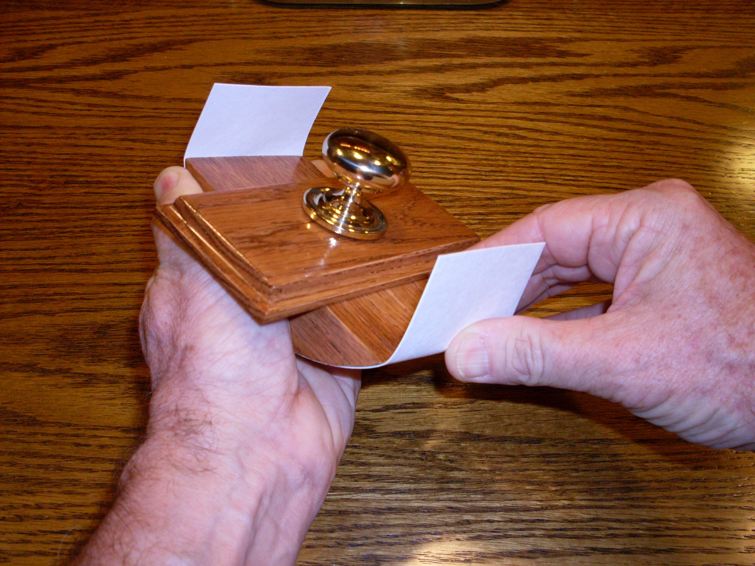 My favorite for standard sized is the large round polished brass with wide base pictured on the “natural” color blotter in the middle.